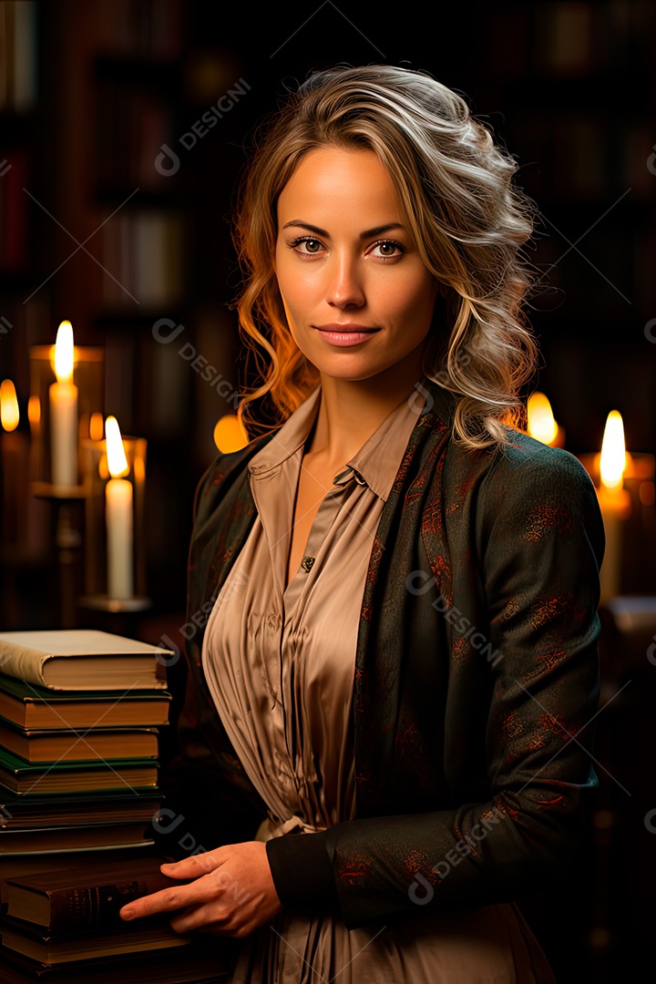 Uma professora cativante com uma pilha de livros nos braços, Sua presença exala elegância e sabedoria