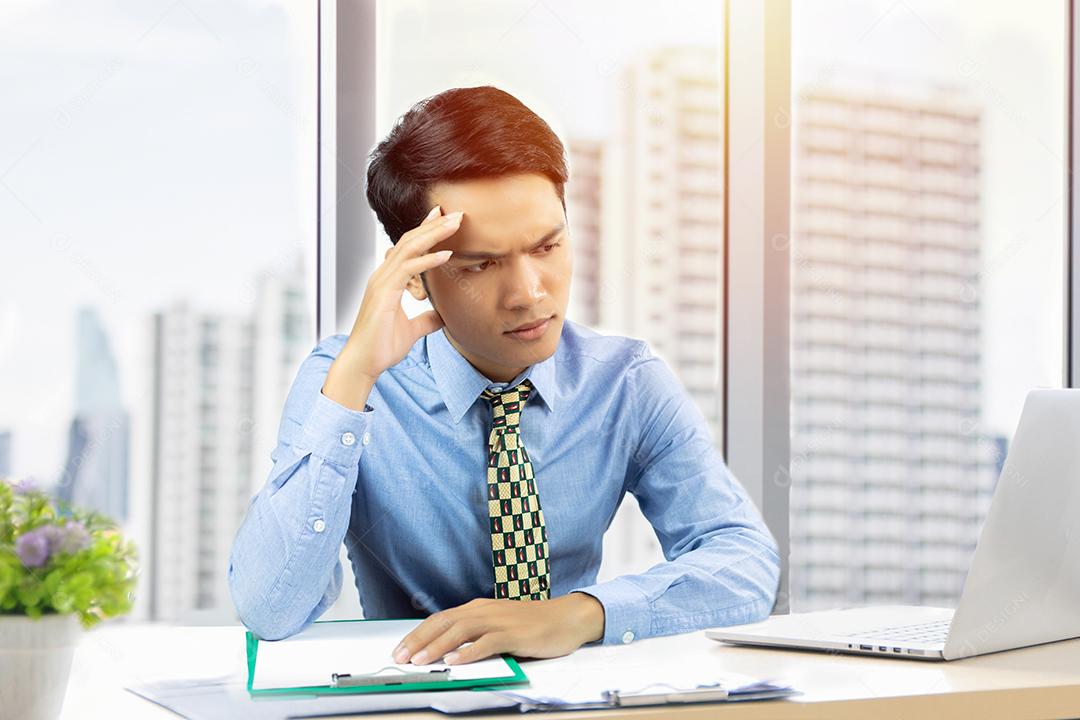 Homem de negócios asiáticos sério sobre o trabalho feito até a dor de cabeça, foco suave