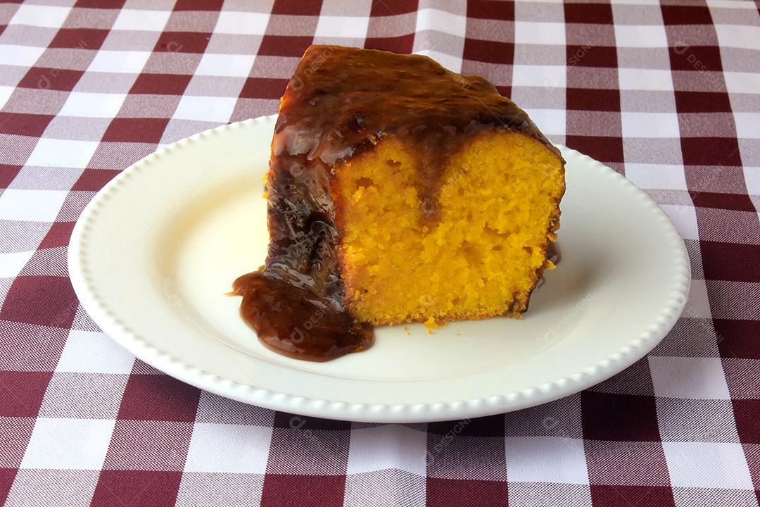 fatia de bolo de cenoura com cobertura de chocolate na placa cerâmi...