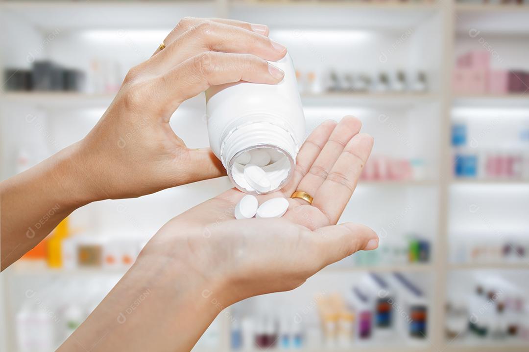 mão do médico segurando o frasco de remédio no armário de remédios e loja de remédios e farmácia