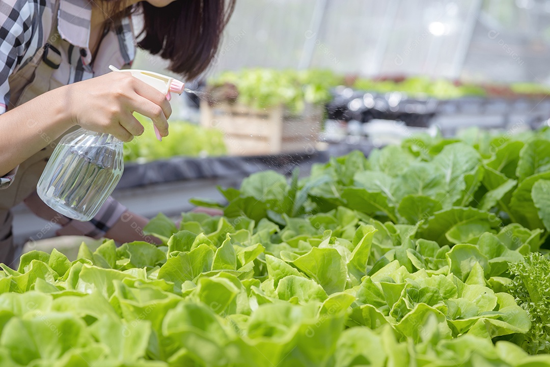 Mão da mulher agricultora pulverização de água hidropônica, cuidados com vegetais orgânicos