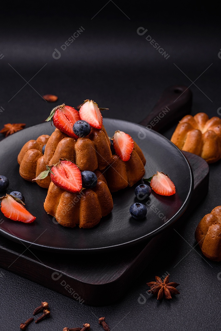 Deliciosos cupcakes ou muffins com passas e nozes, morangos e mirtilos num prato de cerâmica sobre uma mesa de concreto texturizado