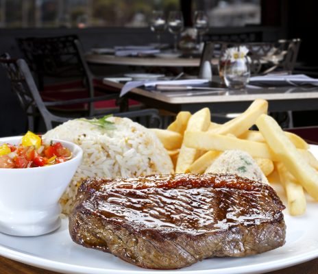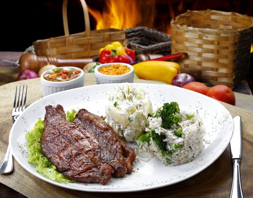 Arroz com batatas fritas salada e bife