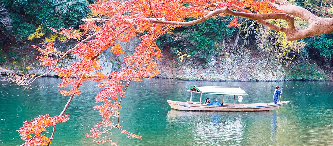 Turistas passeando em belas folhas coloridas Cruzeiro no rio Hozuga...