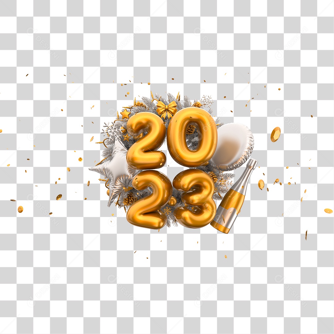 Número 2023 Dourado com Champagne Elemento 3D de Ano Novo PNG Trans...