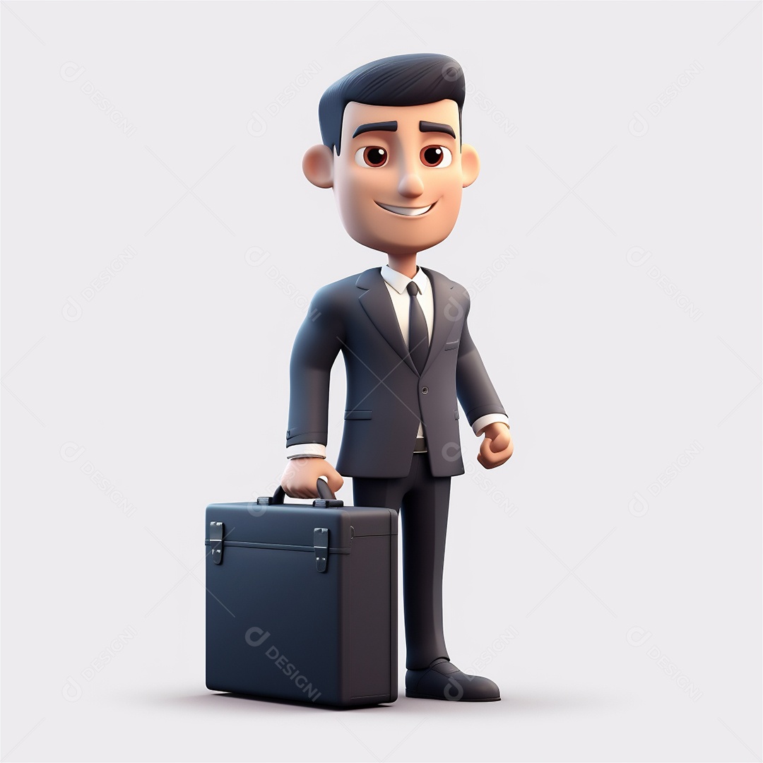 Homem de negócios sorridente segurando maleta isolada no fundo branco. Estilo de desenho animado 3D.
