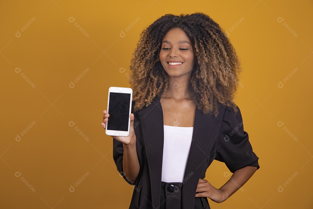 Linda mulher jovem morena cabelo segurando celular smartphone afro ...