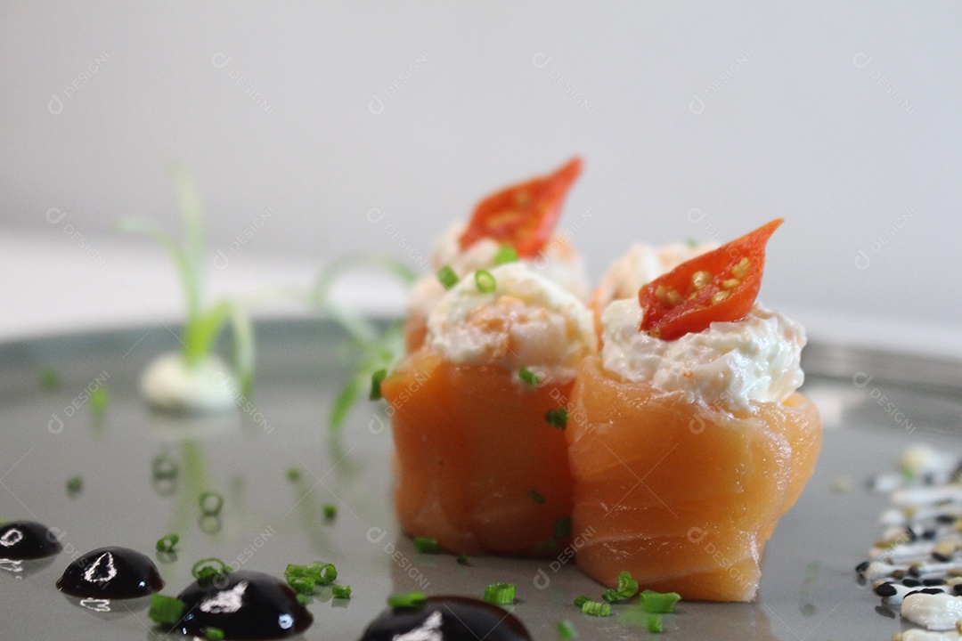 Sushi, cozinha tradicional japonesa. Vários sushi delicioso no prat...