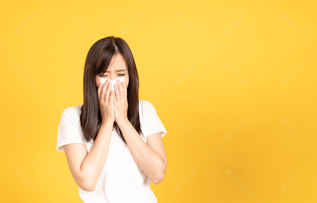 Jovem asiática vestindo camiseta branca em pé e chorando