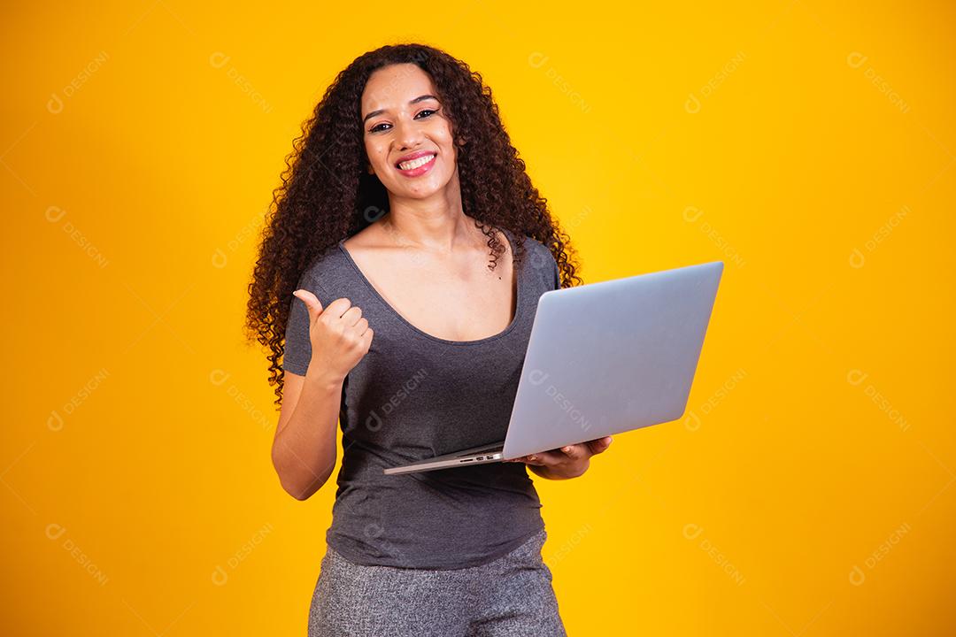Retrato de garota confiante e inteligente usando um laptop e aparecendo o polegar.