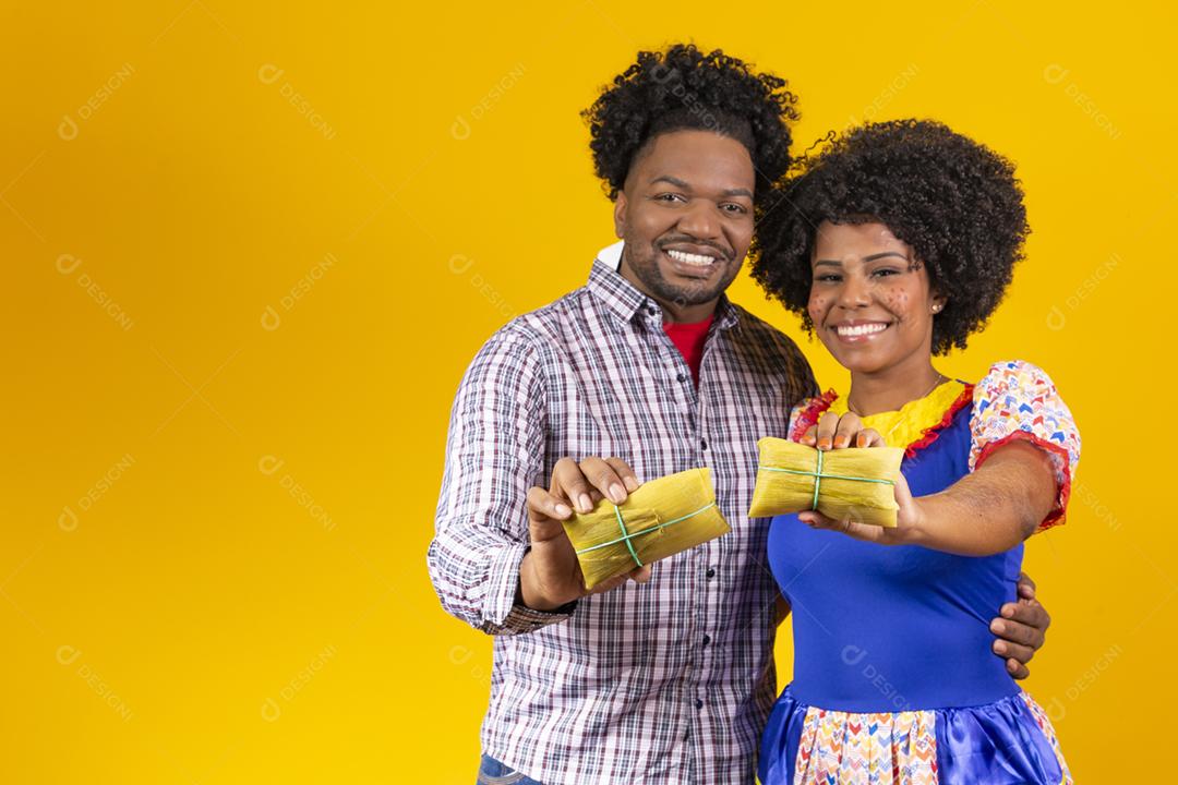 casal de namorados afro em roupas de festa junina segurando uma pamonha