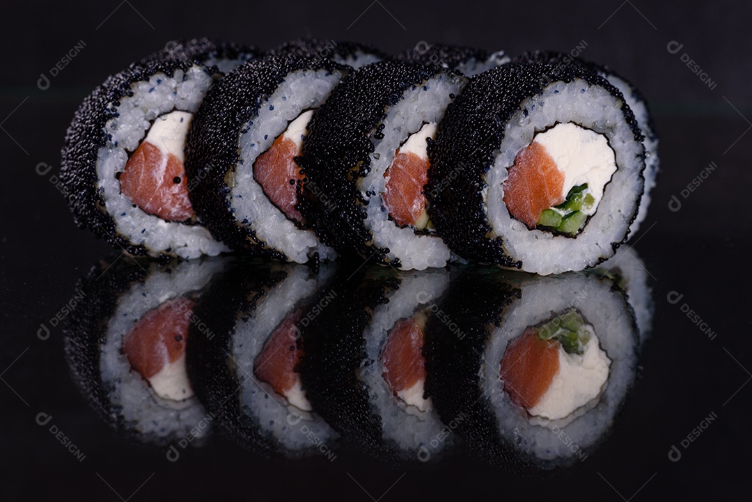 Rolos de sushi lindos e deliciosos frescos em um fundo escuro