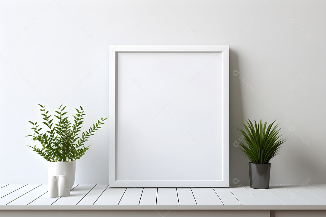 Moldura de pôster vertical em branco na mesa no interior da sala de...