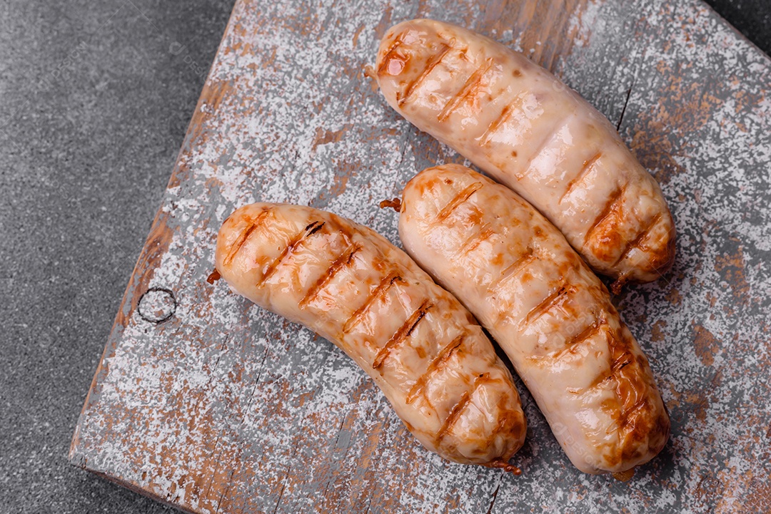 Deliciosas salsichas grelhadas de frango ou carne de porco com sal,...