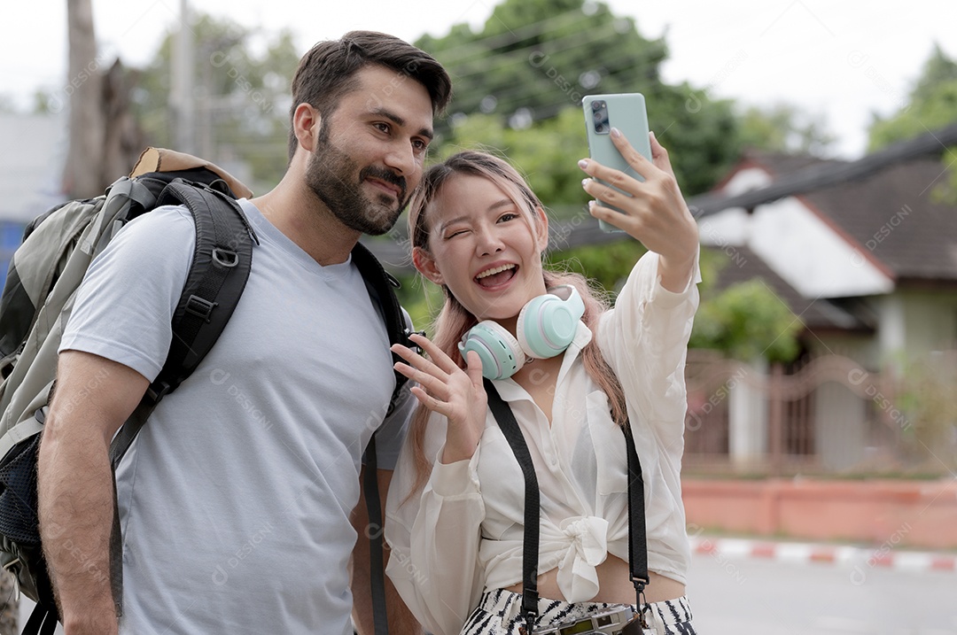 Jovem casal inter-racial viajando juntos, mulher asiática em busca ...