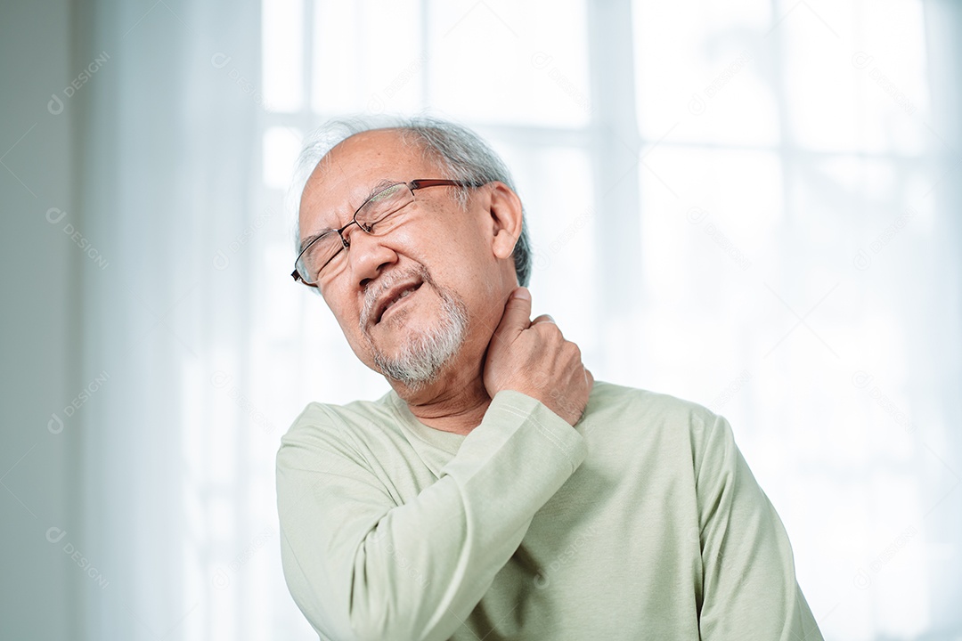 Idoso asiático sênior sente dor no pescoço sua dor no pescoço comov...