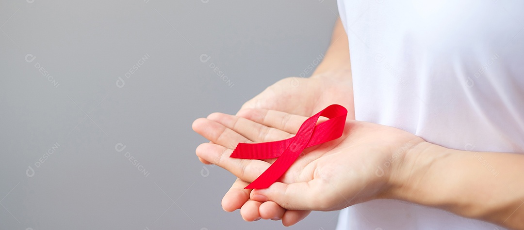 Mão segurando a fita vermelha para dezembro Dia Mundial da Aids (sí...
