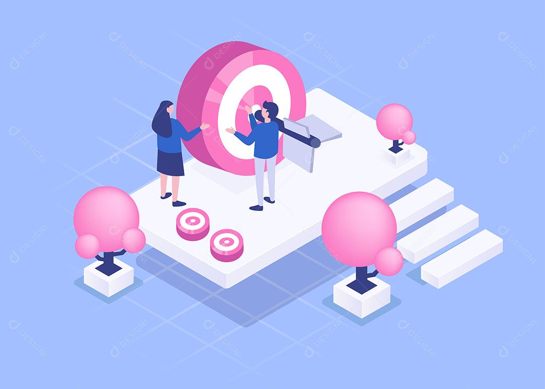 Visual com jovem empresário e mulher tem plano de reunião para trabalhar e criar alvo e trabalhar em telefone celular, conceito de trabalho de tecnologia, ilustração vetorial isométrica