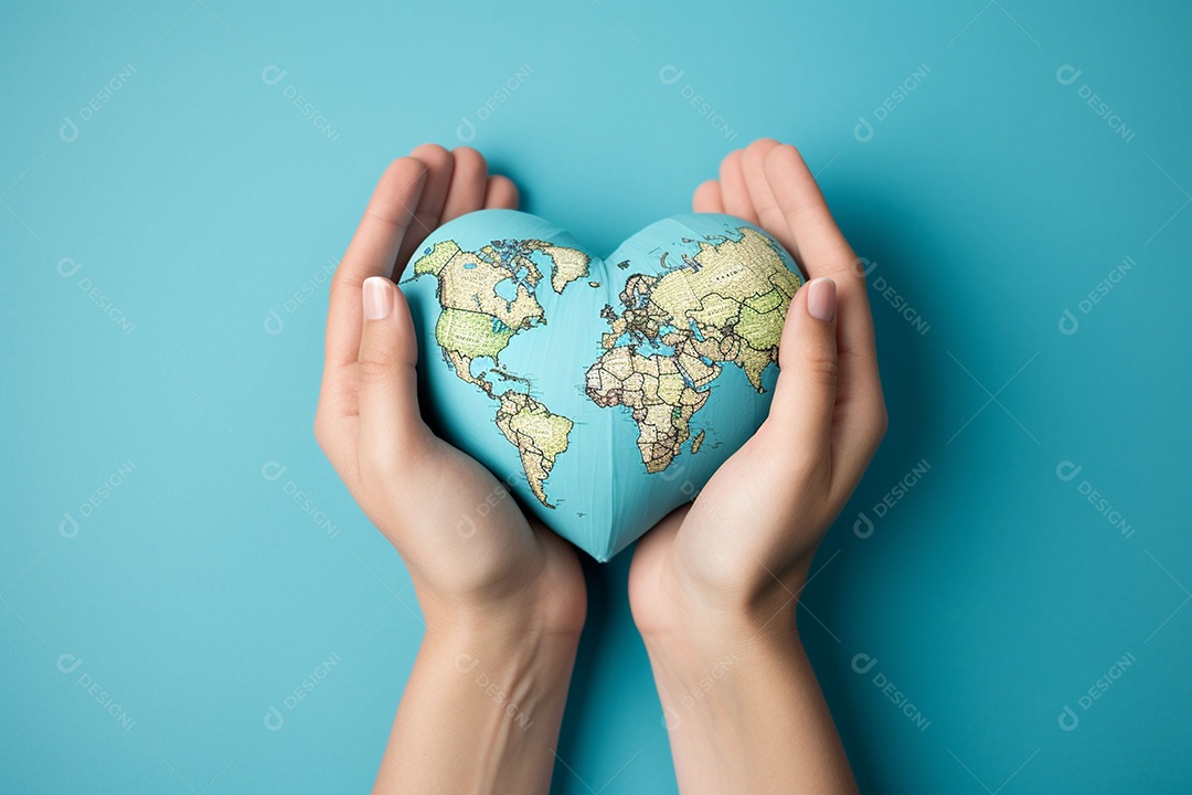 Mãos femininas pintadas no coração fórmico do mapa mundial