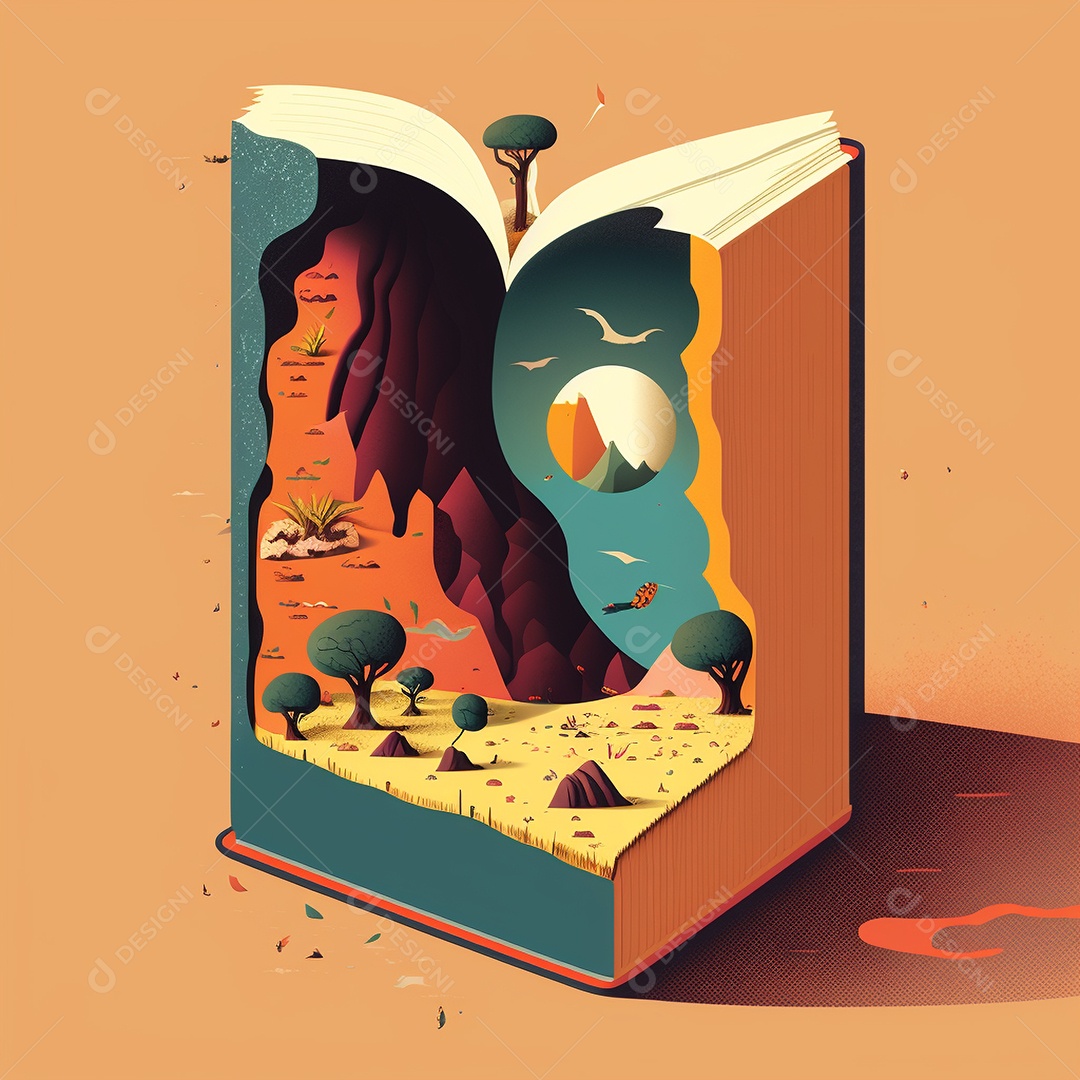 Ilustração do Dia Mundial do Livro dos desenhos animados de design plano. Livro aberto com histórias saindo das páginas. IA gerada. conceito de data comemorativa