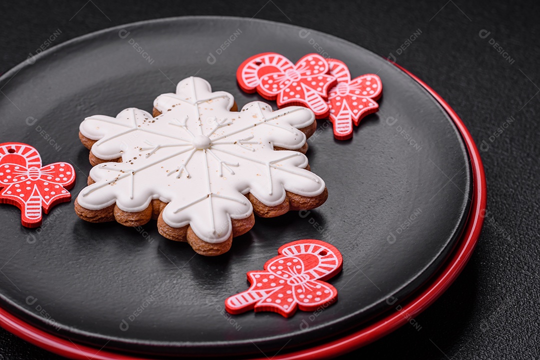 Uma bela composição de Natal composta por pratos de cerâmica, pão de gengibre e outros elementos de decoração de Ano Novo sobre um fundo escuro de concreto