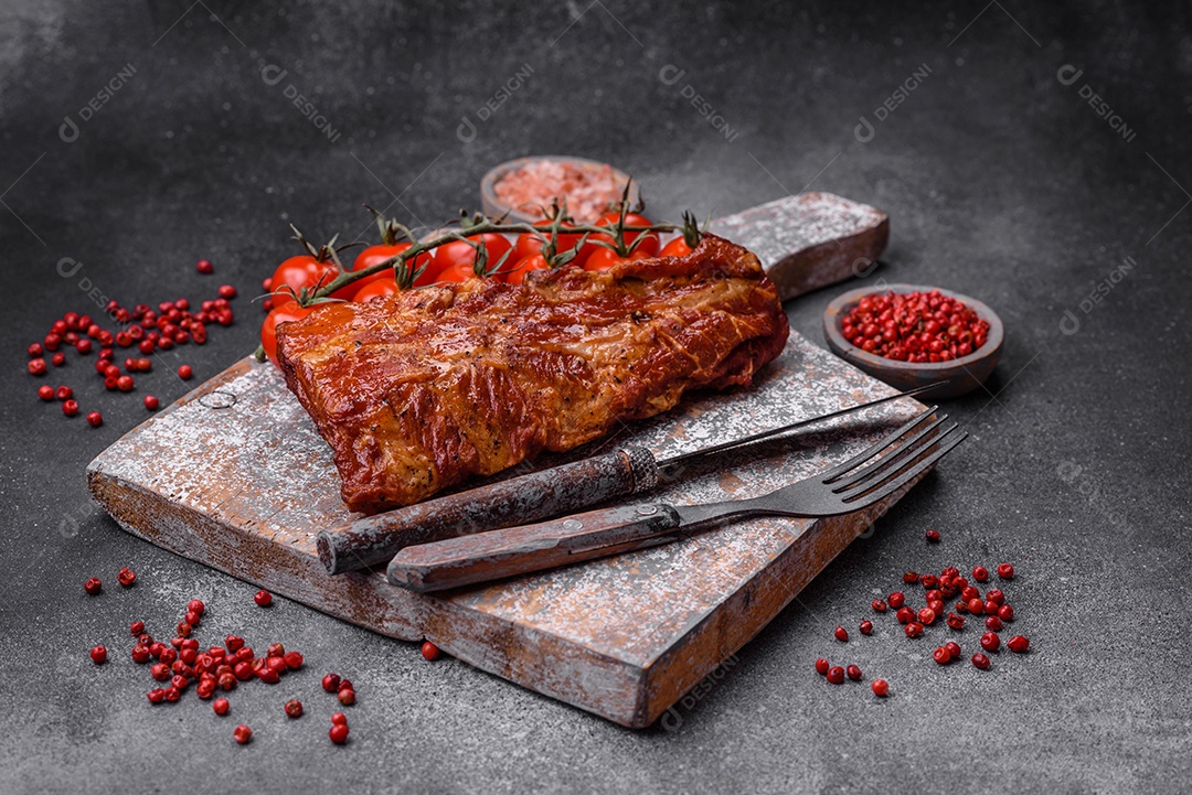 Deliciosas costelas de porco grelhadas ou defumadas com sal, especi...