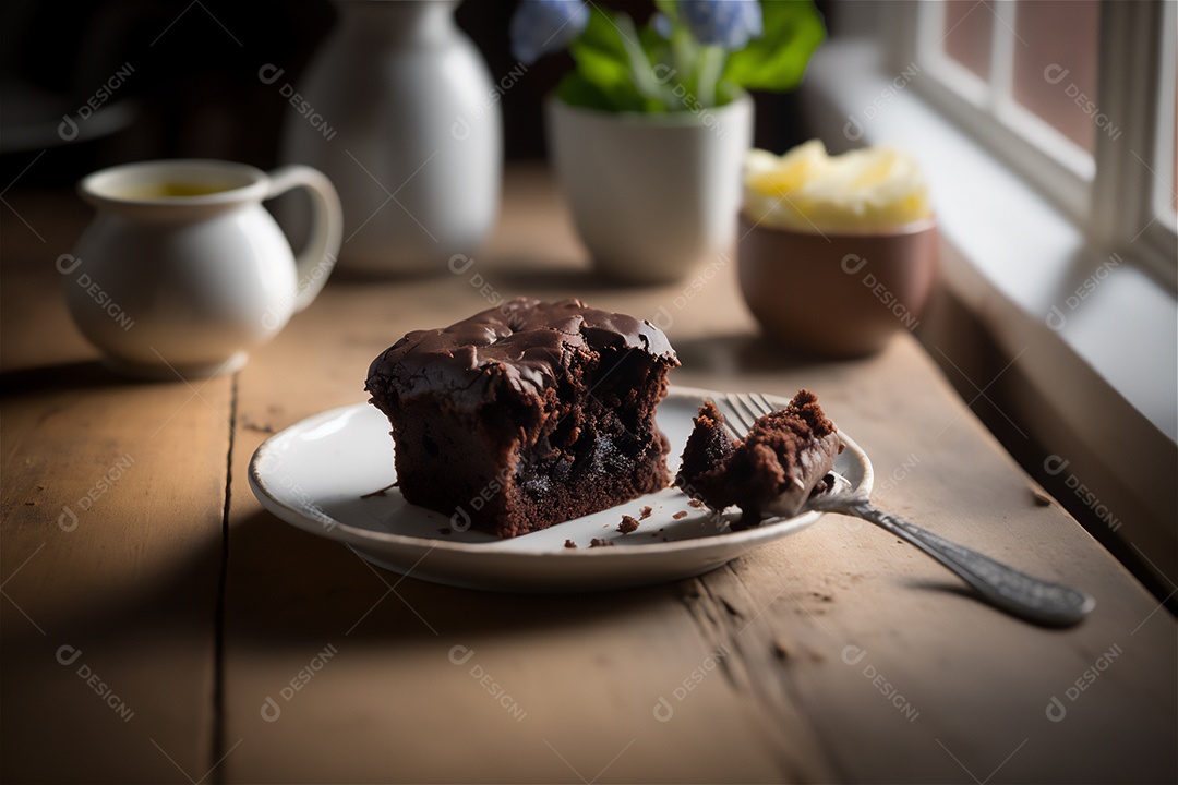 Delicioso brownie de chocolate caseiro em placa de cerâmica branca na mesa de madeira rústica