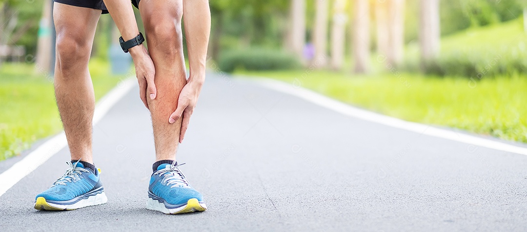 Macho adulto jovem com sua dor muscular durante a corrida. homem corredor com dor na perna devido a talas de canela. Lesões esportivas e conceito médico