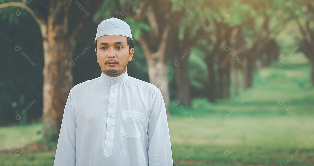 Homem muçulmano religioso tradicional kandura orando ao ar livre em raios de sol de ambiente de natureza tranquila.