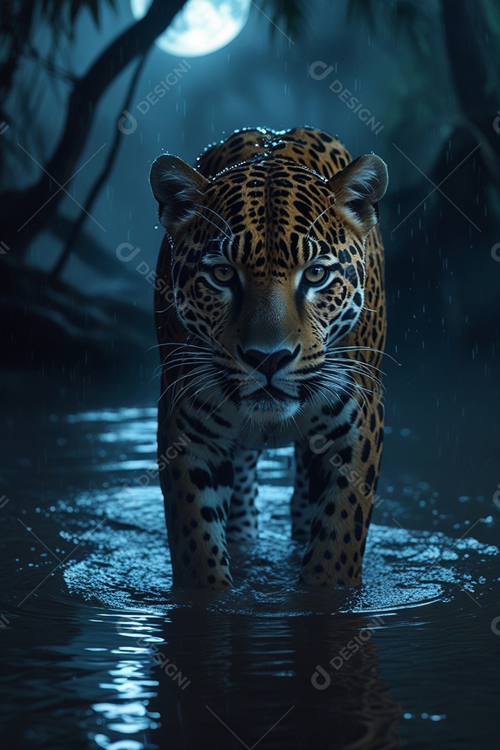 Onça pintada em meio a natureza andando ao anoitecer