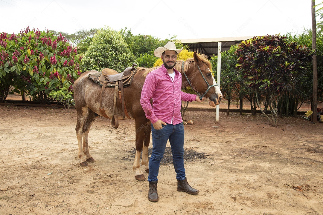 Homem jovem agricultor sobre fazenda com seu cavalo