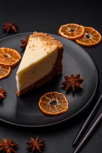 Delicioso bolo de cheesecake doce em fundo de concreto texturizado....