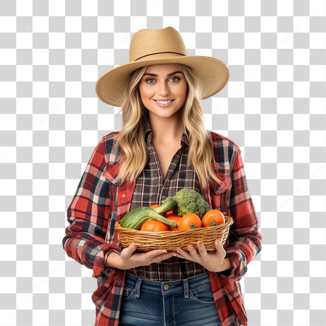 Mulher Fazendeira com Caixa de Frutas e Legumes nas Mãos PNG Transp...