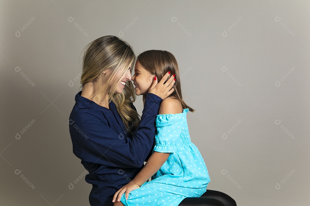 Belo retrato de mãe e filha sorridente sentada ao colo sobre fundo isolado