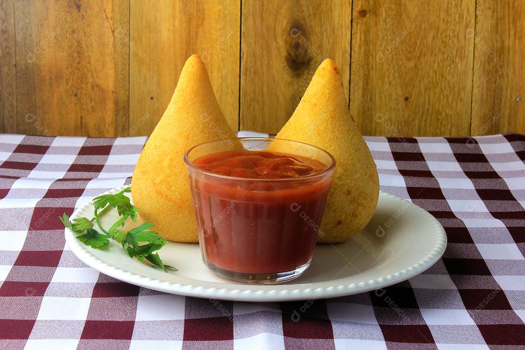 Coxinha no prato, petiscos da cozinha tradicional brasileira recheados com frango, na mesa de madeira rústica