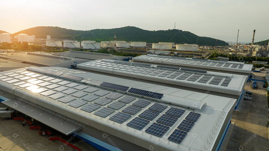 Vista superior da célula solar na fábrica de armazém. Energia do sistema de painéis solares fotovoltaicos ou célula solar no telhado do edifício industrial para produzir eletricidade ecológica verde. Produção de energia renovável.