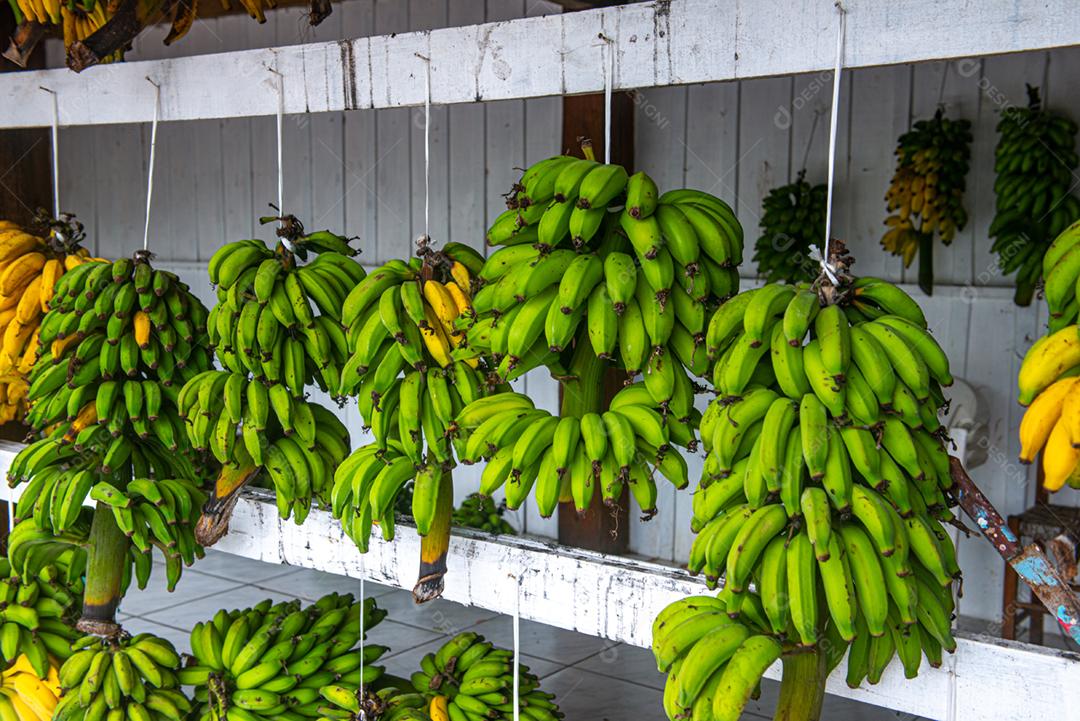 Cachos de bananas maduras e verdes em exposição para venda em uma feira.