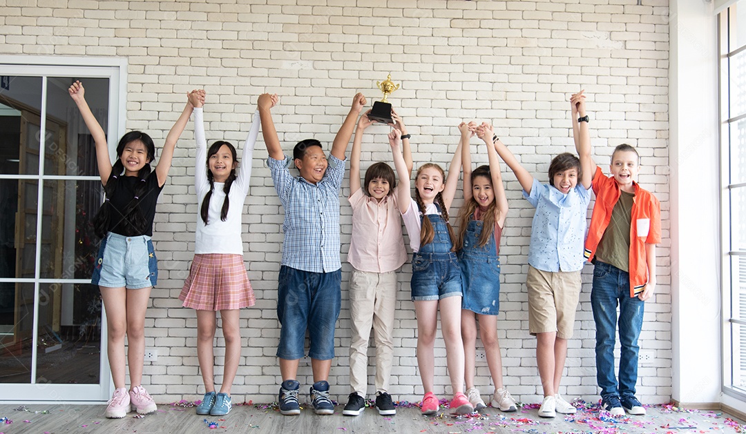 Meninas e meninos da escola internacional de ensino fundamental expressam sua alegria depois de receberem o prêmio Outstanding Classroom.