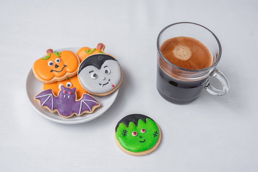Café expresso quente ou xícara de chocolate com biscoitos engraçados de Halloween. Feliz dia de Halloween, truque ou ameaça, Olá outubro, outono outono, tradicional, festa e conceito de férias