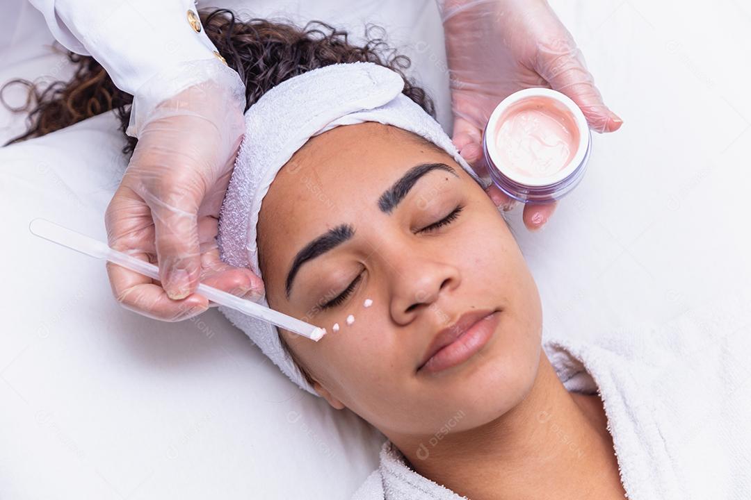 Mulher bonita com gotas de creme no rosto e o frasco ao lado. Mulher aplicando creme para o rosto. conceito de spa