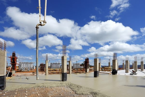 Guindaste sobre esteiras contra céu azul e nuvens brancas.