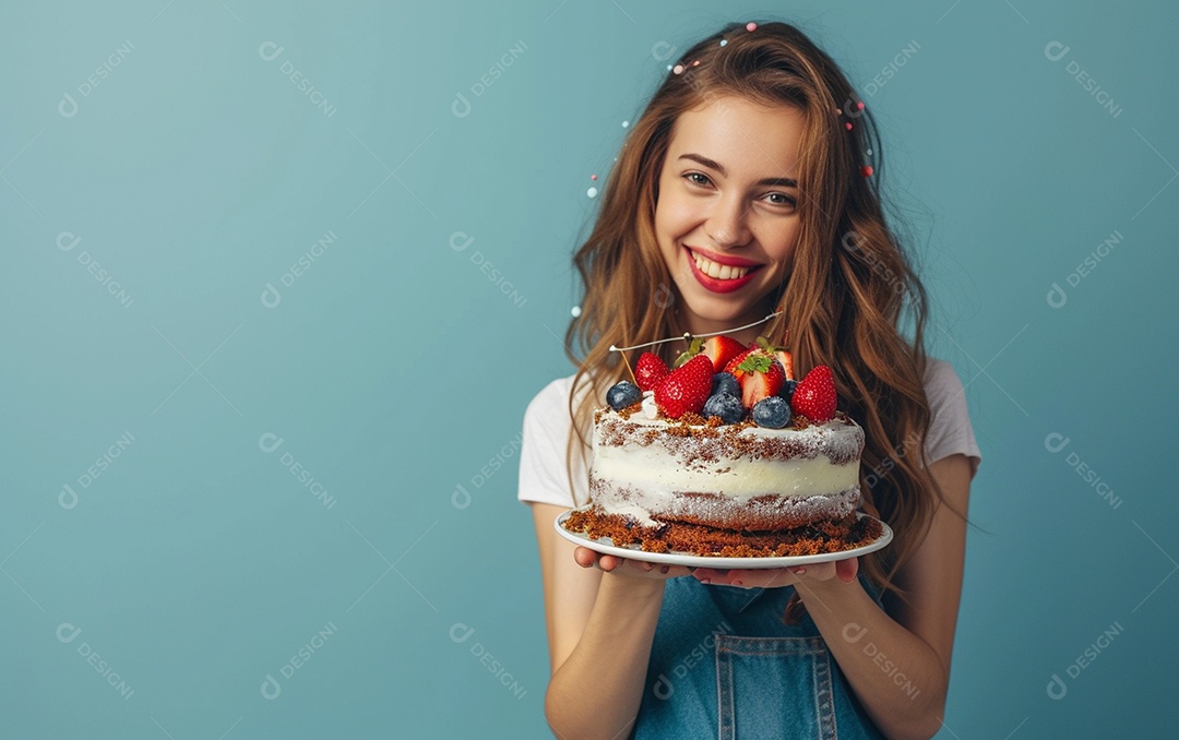 Menina com bolo mostrando sobremesa em fundo de cor sólida