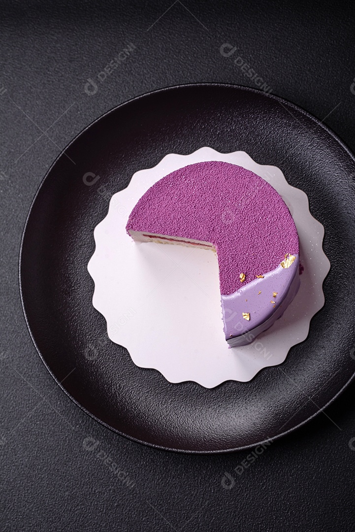 Delicioso bolo de mousse doce fresco com recheio de frutas vermelhas coberto com cobertura de veludo rosa sobre fundo escuro de concreto