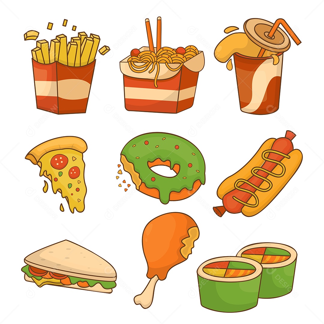 Conjunto de deliciosos fast food ou junk food, batatas fritas, rosquinhas, frango frito, hambúrgueres