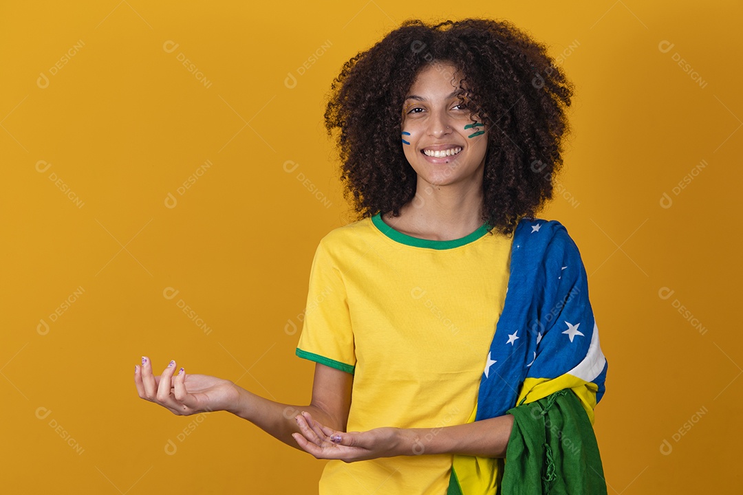 Mulher afro-brasileira vestindo camiseta do Brasil fazendo gestos