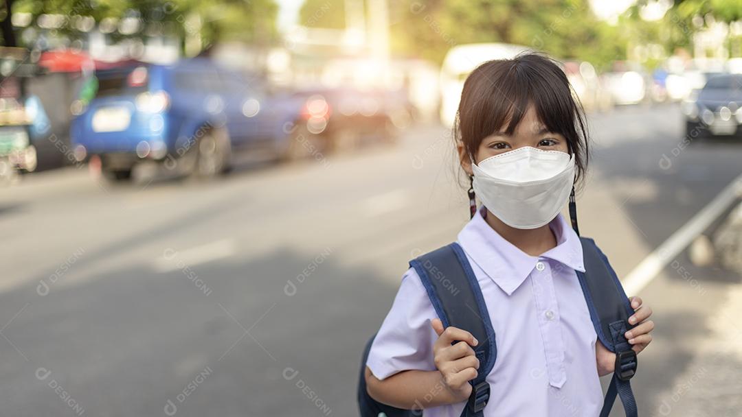 Menina asiática de retrato usa máscara para proteger a poeira PM 2,5 e