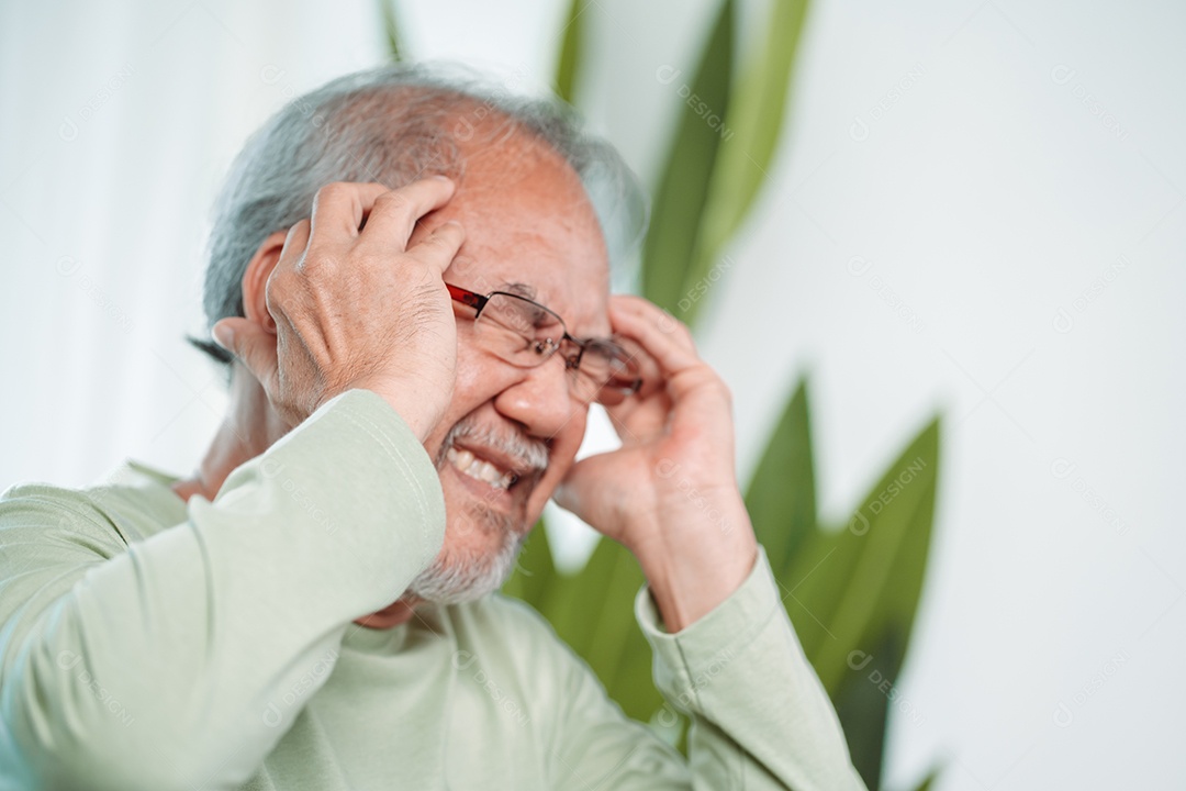 Idoso asiático sente dores de cabeça e enxaqueca na sala de estar em casa.