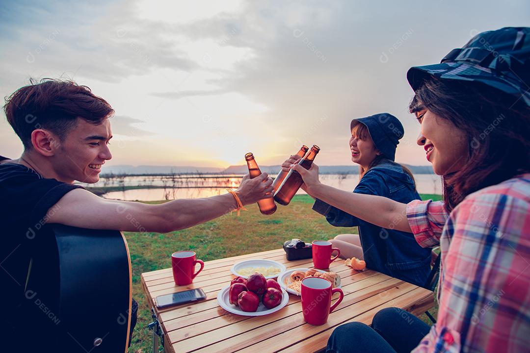 Um grupo de amigos asiáticos turista bebendo cerveja alcoólica e tocando violão junto com felicidade no verão enquanto acampa perto do lago ao pôr do sol