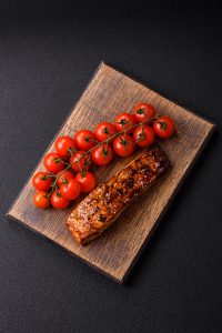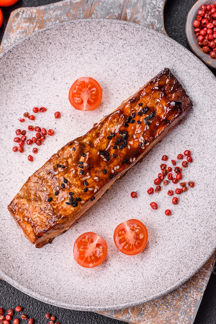 Delicioso salmão vermelho grelhado com molho e gergelim, especiaria...