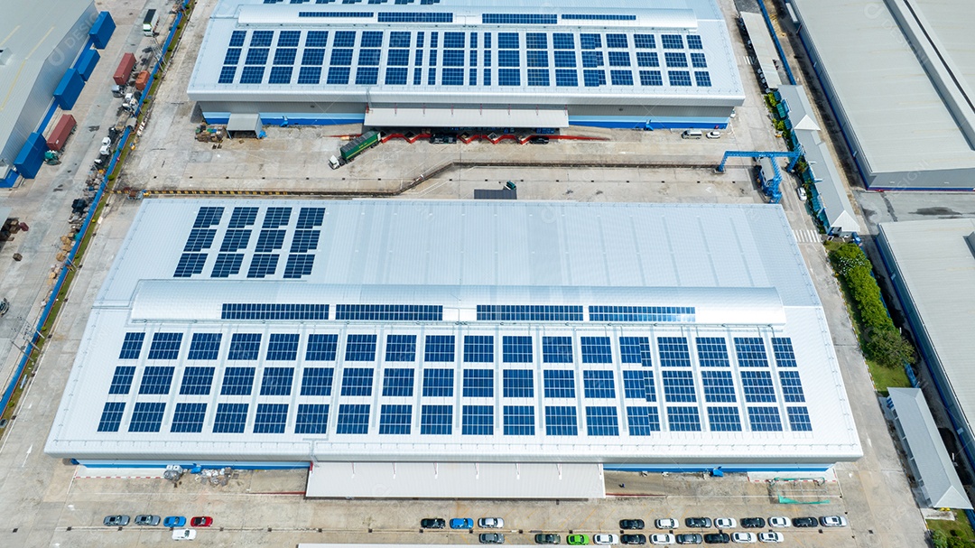 Vista superior da célula solar na fábrica de armazém. Solor foto voltaica
